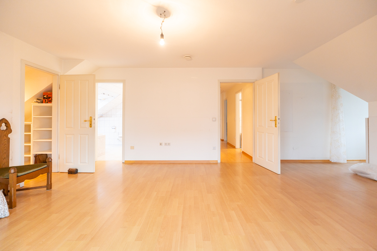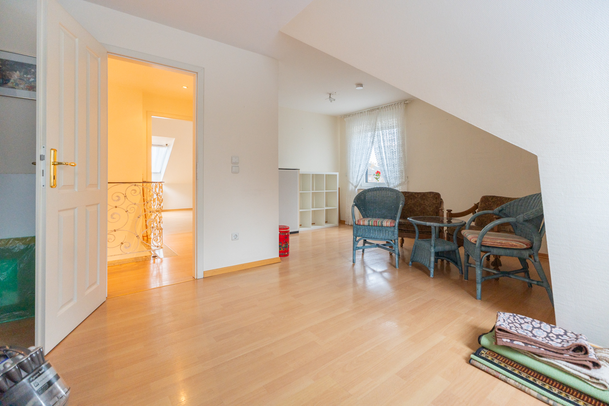 Im Obergeschoss genießen die Eltern ein großzügiges Schlafzimmer mit angrenzendem Ankleideraum und direktem Zugang zum eigenen Balkon. Ergänzt wird der Bereich durch ein stilvolles Bad, in dem ein Whirlpool für pure Entspannung sorgt. Zwei weitere Schlafzimmer sowie ein zusätzliches Badezimmer bieten ausreichend Platz für die ganze Familie. Das vollunterkellerte Haus eröffnet vielfältige Nutzungsmöglichkeiten für Hobbyräume, Homeoffice oder Abstellflächen, ergänzt durch einen Dachboden, der zusätzlichen Stauraum bietet.