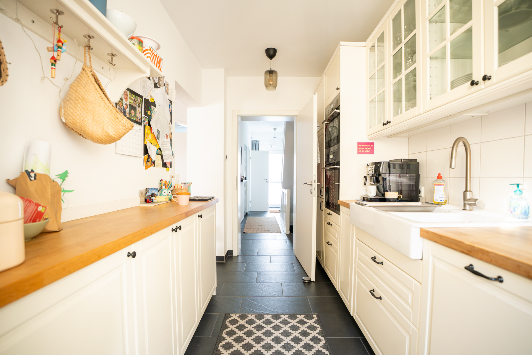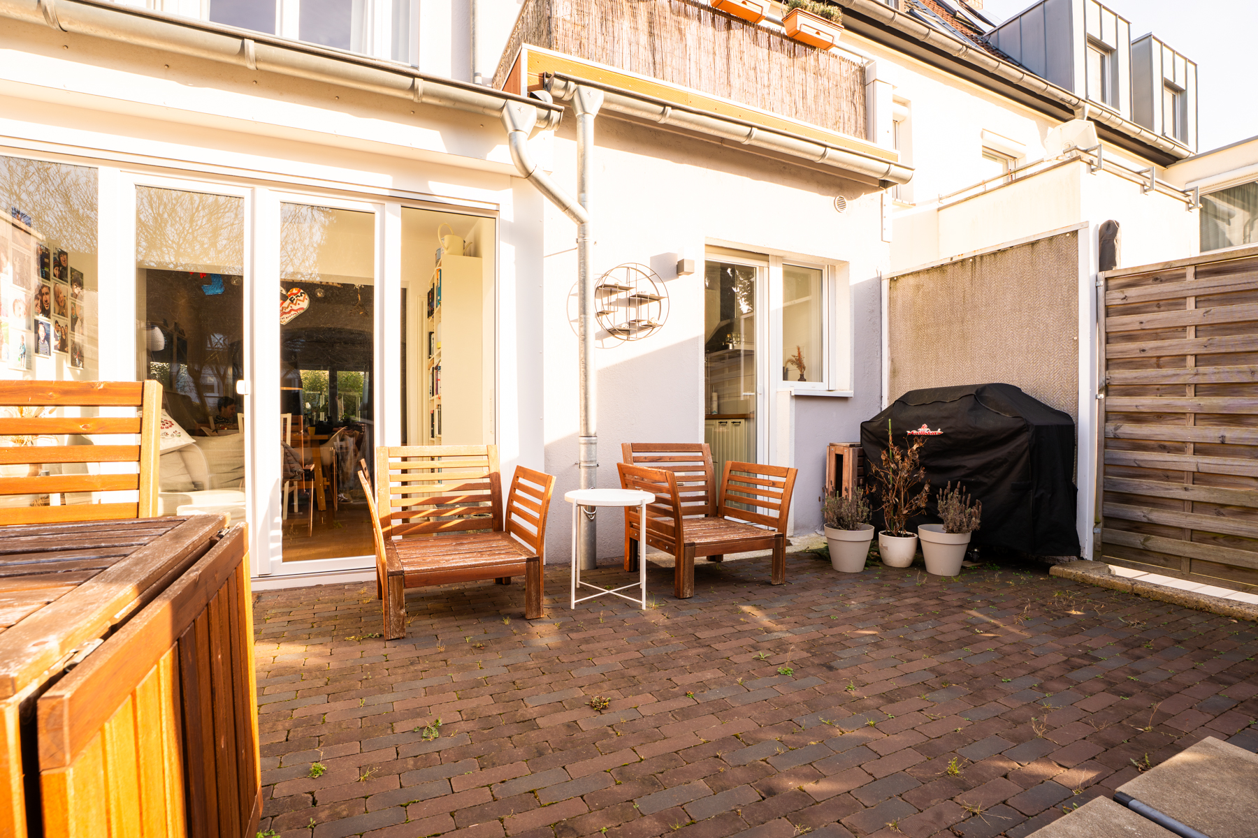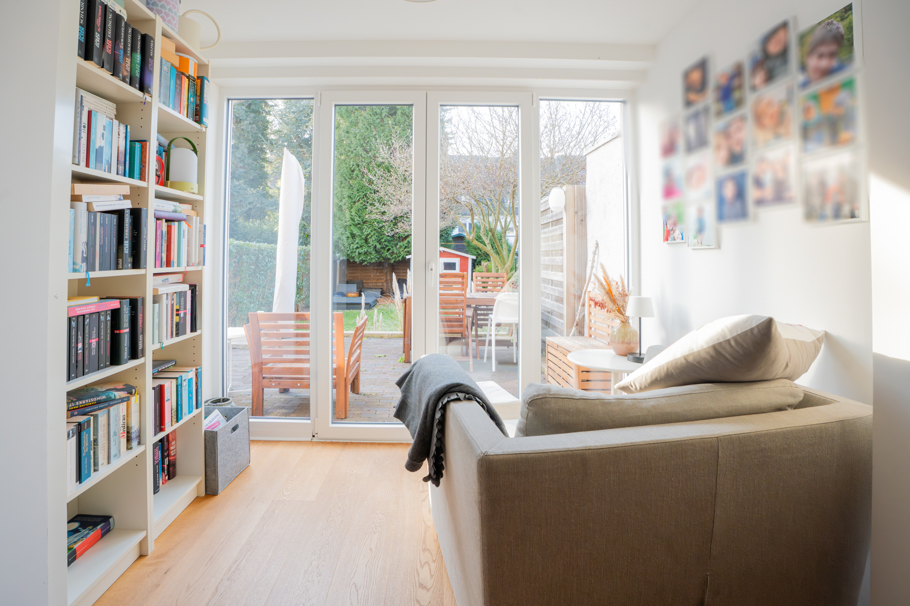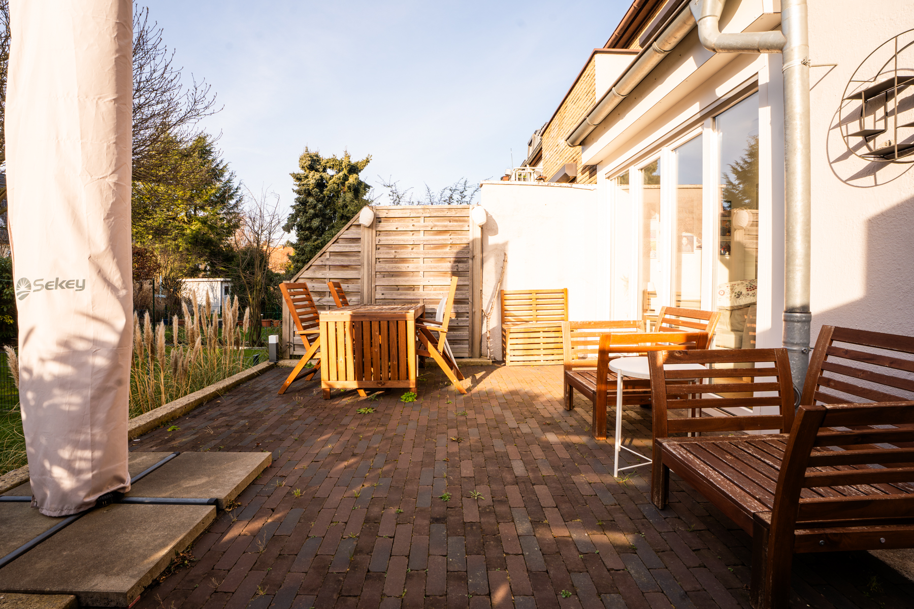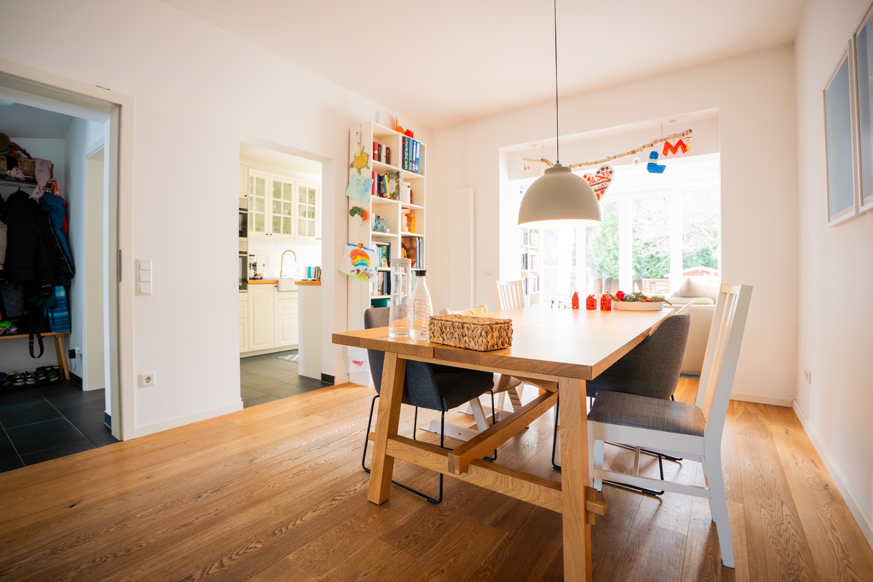 Darüber hinaus erwartet Sie hier eine neuwertige Einbauküche im skandinavischen Stil mit direktem Zugang zur großzügigen Terrasse und zum liebevoll angelegten Garten, der unter freiem Himmel wertvolle Familienzeit verspricht. Die Kinder können sich im eingelassenen Sandkasten austoben, während die Eltern auf der Lounge entspannen. Ergänzt wird das Erdgeschoss durch ein modernes WC.