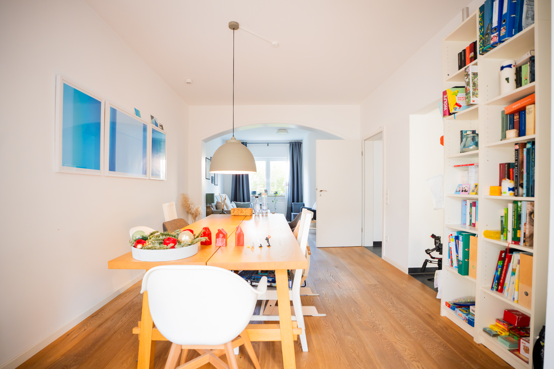 Das Herz der Immobilie bildet das Erdgeschoss, das durch seine besonders warme Atmosphäre besticht. Hochwertiges Eichenparkett prägt den gemütlichen Wohn- und Essbereich, der durch einen eleganten Rundbogen verbunden ist und einen schönen Blick in den Garten bietet. Ein Kaminofen kann problemlos eingebracht werden, da ein zusätzlicher Zug bereits vorhanden ist.
